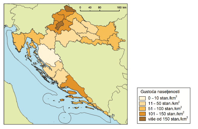 Koje je ime županije Primorske (Jadranske) Hrvatske s prosječnom gustoćom naseljenosti u razredu od 51 do 100 stan.
