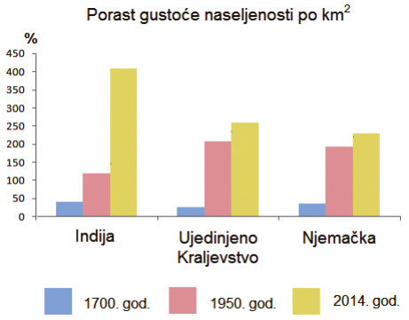 Usporedite promjene u gustoći naseljenosti koje su se dogodile u odabranim državama1700., 1950. i 2014. godine.