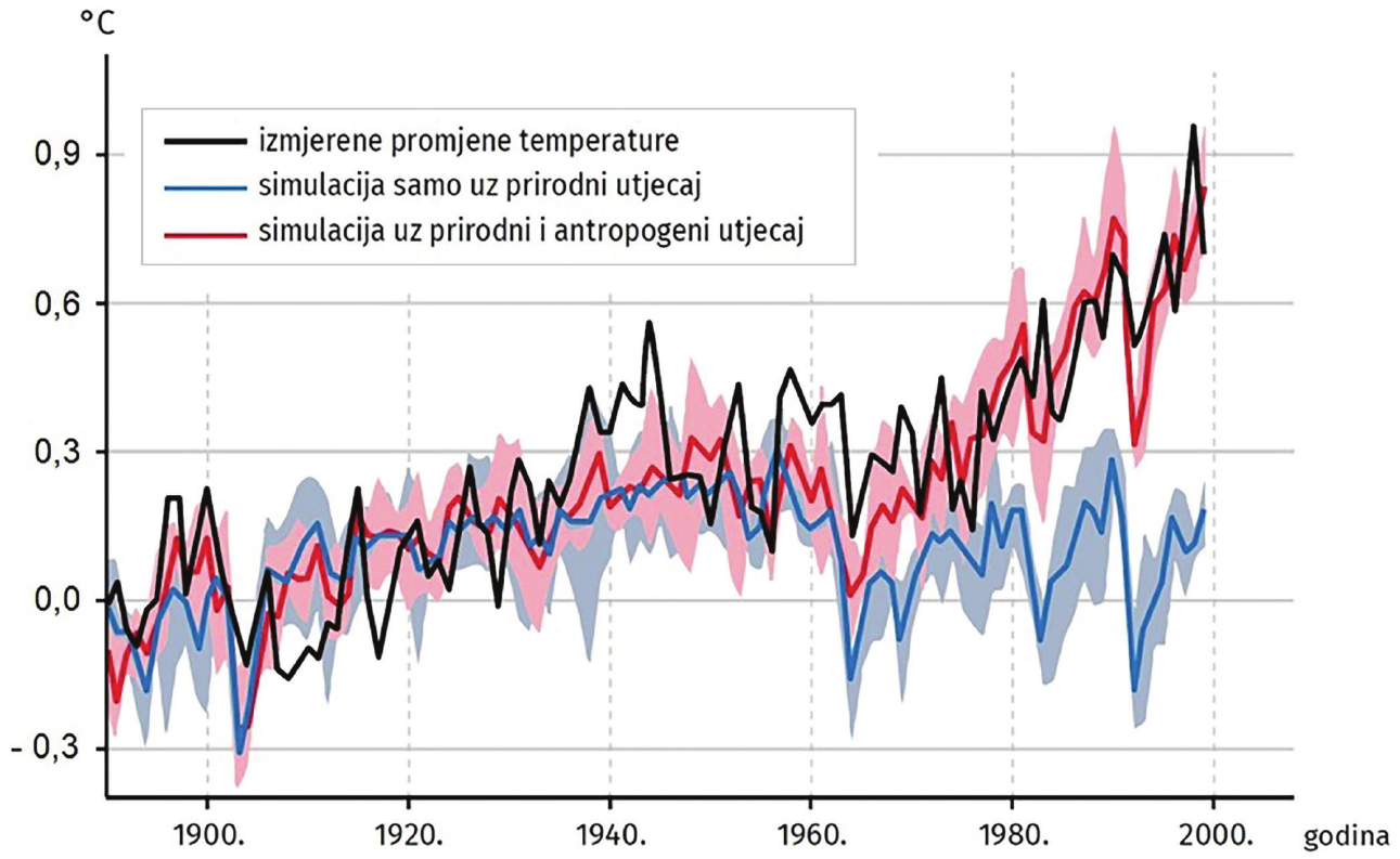 C. Simulacija promjene temperature zraka uz prirodni i antropogeni utjecaj u velikoj se meri poklapa s izmjerenim promjenama temperature zraka.
