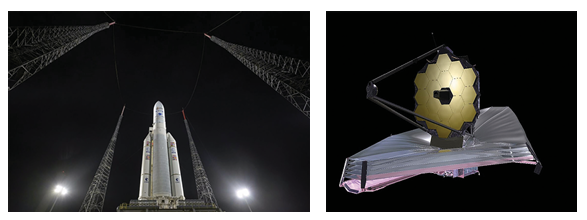 Prva fotografija prikazuje letjelicu koja je ponijela novi teleskop u Zemljinu orbitu, a druga taj teleskop. U kojemu će području elektromagnetskih valova prikazani teleskop prikupljati slike svemira?