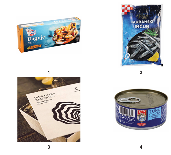 Kojim je brojem označena slika proizvoda od morskih organizama koji nisu proizvod marikulture hrvatskoga dijela Jadranskoga mora?