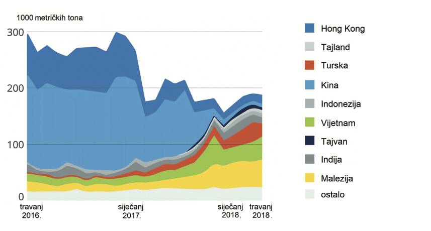 Na dijagramu su prikazane uvoznice plastičnoga otpada iz Europe. Koje je ime azijske države koja je 2018. godine postala najveći uvoznik plastičnoga otpada iz europskih država?