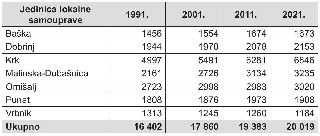 Tab. 6. Kretanje broja stanovnika po jedinicama lokalne samouprave na otoku Krkuod 1991. do 2021. godine