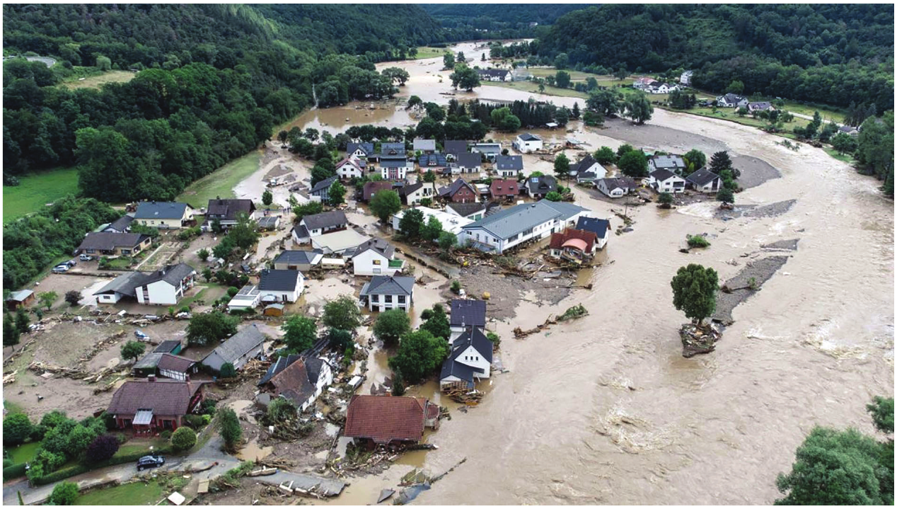 Na fotografiji su prikazane posljedice poplava u Njemačkoj 2021. godine. Opišite glavni uzrok takvih poplava u Njemačkoj te predložite dva pristupa obrani od poplava za naselje prikazano na fotografiji.