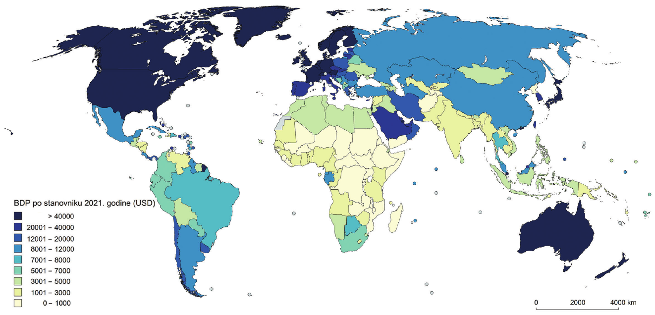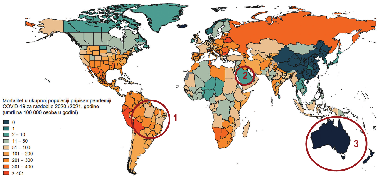 Na prvoj karti prikazan je BDP po stanovniku, a na drugoj geografska raspodjela smrtnosti uzrokovane pandemijom COVID-19 za odabrane države svijeta označena brojevima 1, 2 i 3. Za svako označeno područje opišite odnos broja umrlih tijekom pandemije COVID-19, životnoga standarda i razine zdravstvene zaštite.