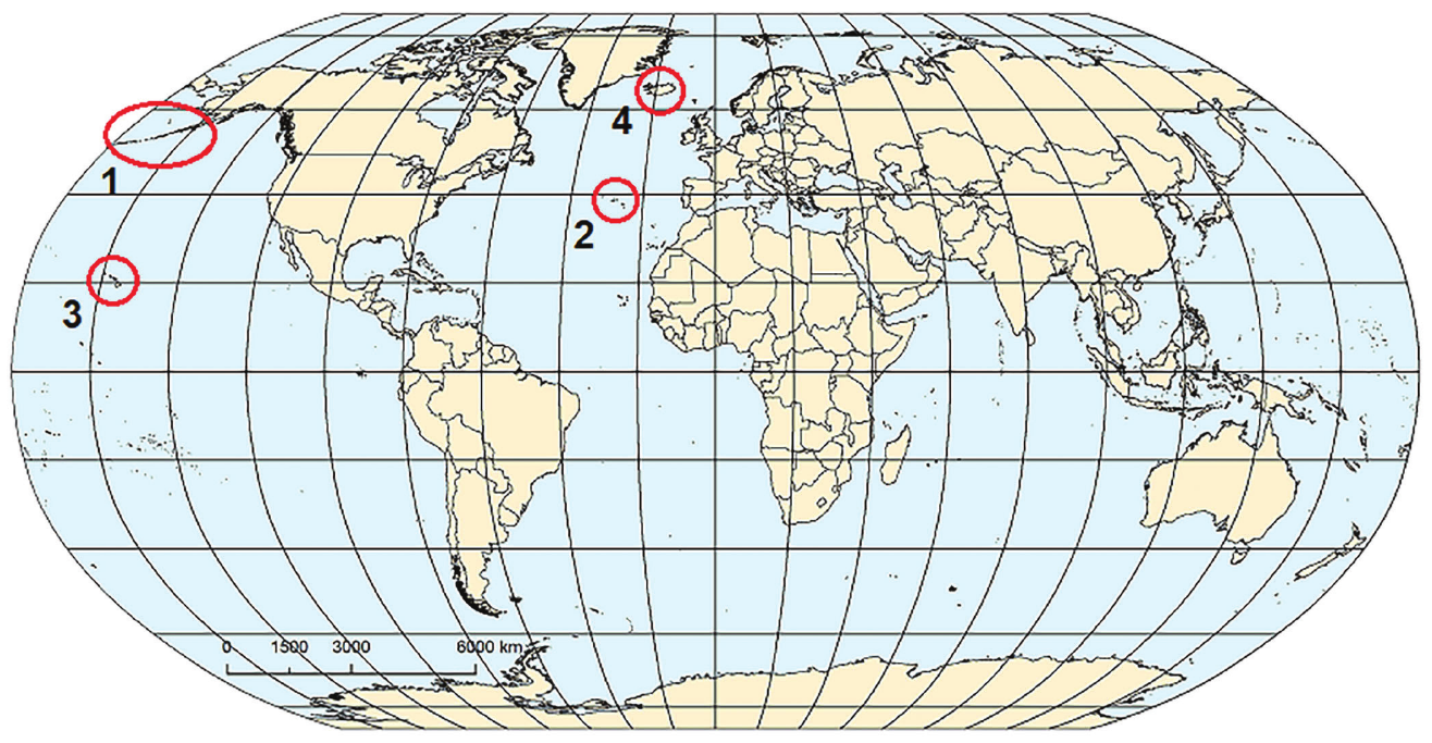 Kojim je brojem na geografskoj karti označeno otočje nastalo na konvergentnoj granici litosfernih ploča?