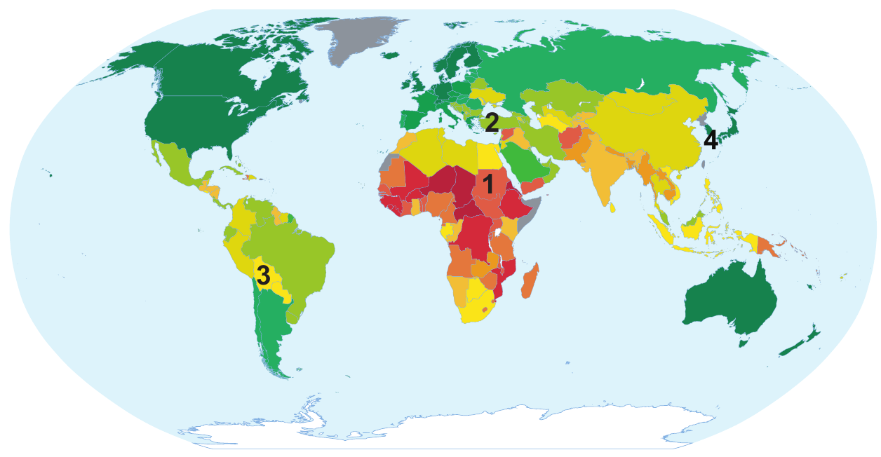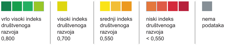 Na priloženoj geografskoj karti prikazan je indeks društvenoga razvoja za 2017. godinu. Kojim je brojem označena država koja je imala najkraće očekivano trajanje života?
