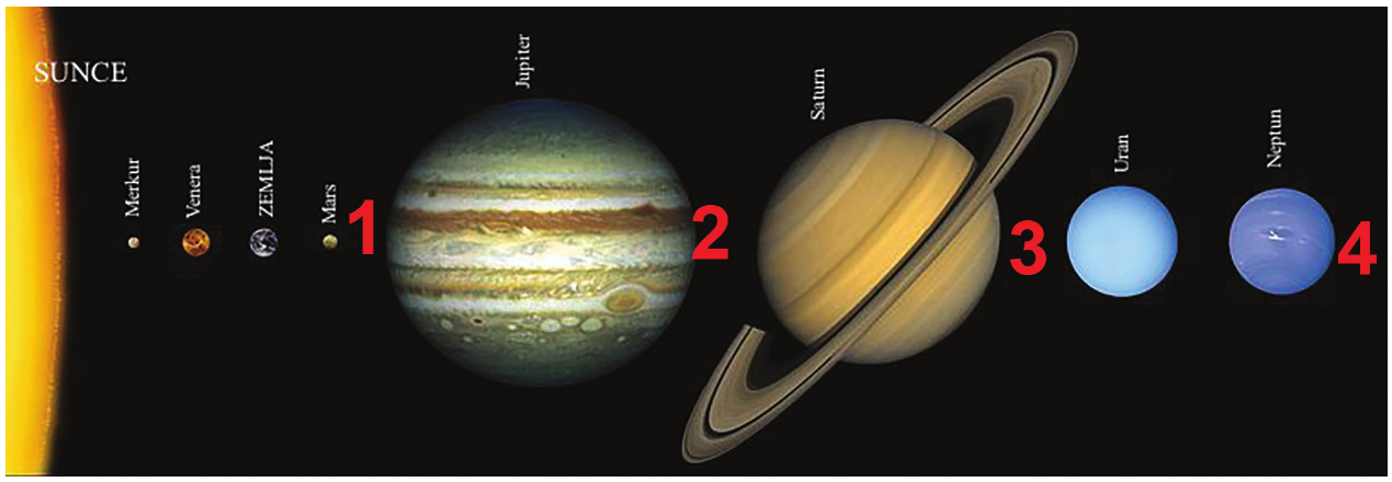Na grafičkome prilogu prikazani su planeti Sunčeva sustava (mjerilo nije očuvano za udaljenosti). Kojim je brojem označen pojas u kojemu se nalazi Ceres?