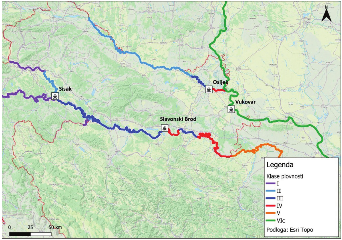 Koja rijeka na priloženoj geografskoj karti označena klasom plovnosti ima najpovoljnije uvjete za razvoj riječnoga turizma na kruzerima?