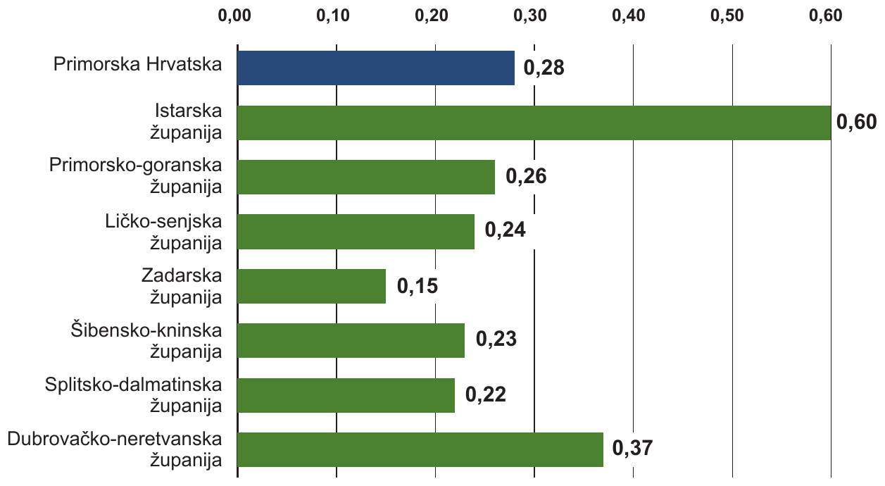 Priloženi dijagram prikazuje indeks prosječne potrošnje vode po noćenju turista u usporedbi s potrošnjom vode stalnoga stanovništva u županijama Primorske Hrvatske.