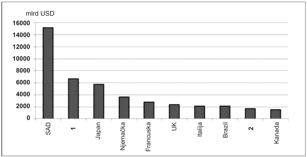 Riješite sljedeće zadatke s pomoću priloženoga dijagrama na kojemu su prikazane države s najvećim ukupnim BDP-om 2011. godine u svijetu. Dvije su države označene brojevima 1 i 2.