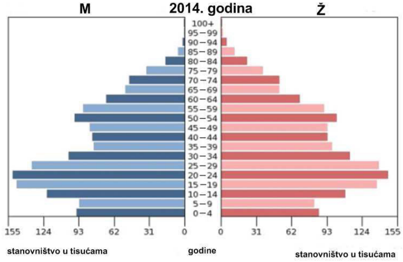 Riješite zadatak uz pomoć priloženih dijagrama. Na crte ispod svakoga dijagrama upišite ime države kojoj pripada određeni tip dobno-spolne strukture stanovništva. Odaberite između sljedećih država: Albanija, Hrvatska, Kanada, Njemačka i Peru.