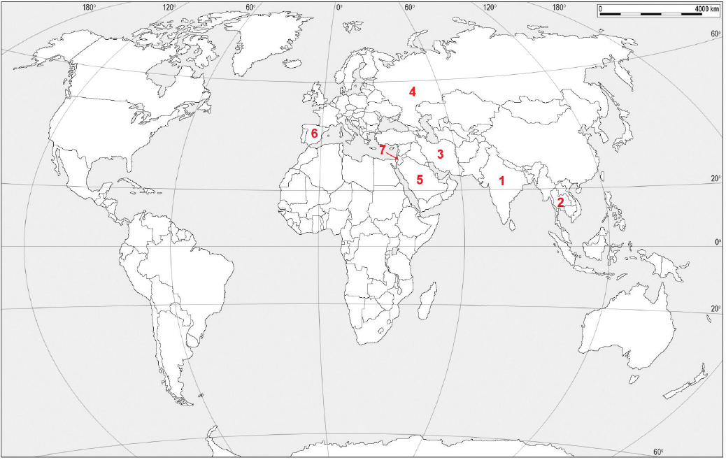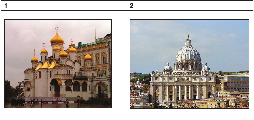 Upišite u tablicu nazive vjeroispovijesti kojima pripadaju građevine prikazane na fotografijama i brojeve kojima su na karti označene države čija većina stanovnika pripada tim vjeroispovijestima.