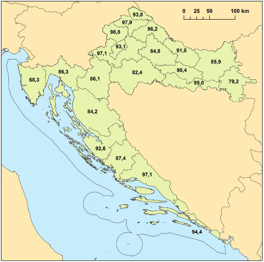 Pozorno promotrite priloženu geografsku kartu na kojoj je prikazan udio Hrvata u županijama Hrvatske (%) prema Popisu stanovništva 2011. godine.