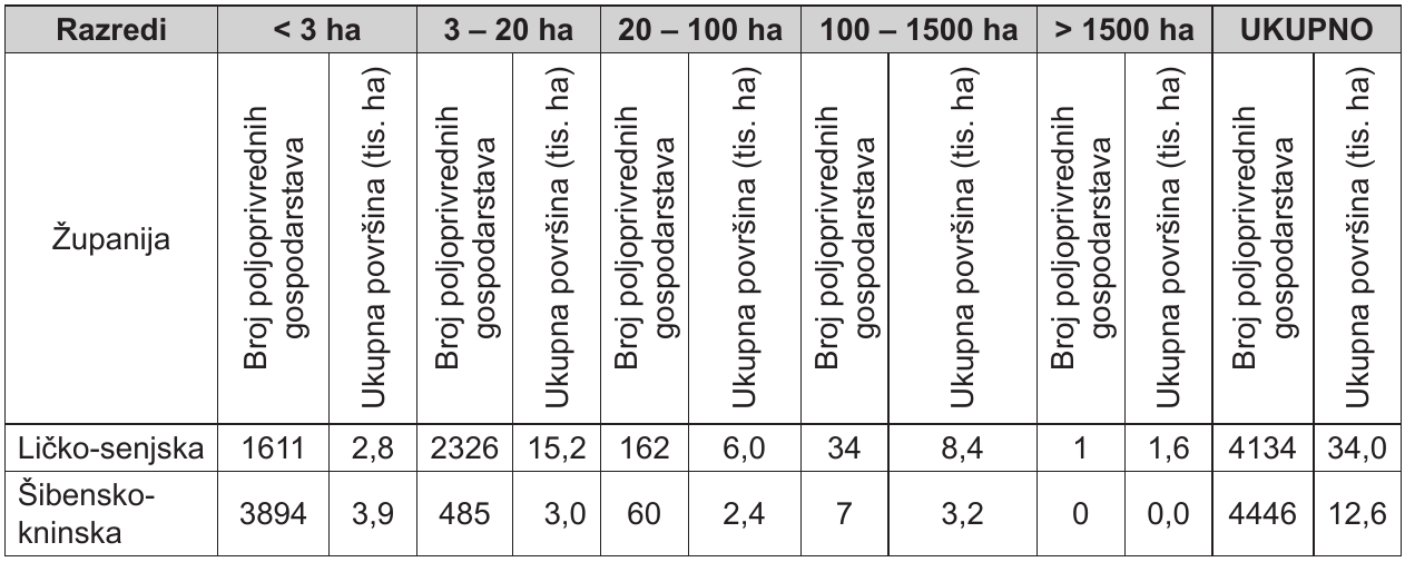 Pozorno promotrite priloženu tablicu strukture poljoprivrednih gospodarstava na području dviju županija Hrvatske 2015. godine.