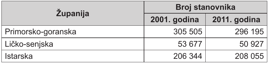 Tab. 3. Županije Sjevernoga hrvatskog primorja prema broju stanovnika 2001. i 2011. godine