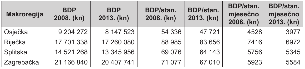 Koje je ime makroregije s najvidljivijim negativnim učincima gospodarske krize od 2008. do 2013. godine?
