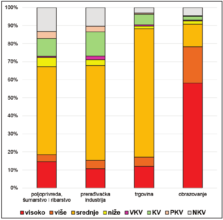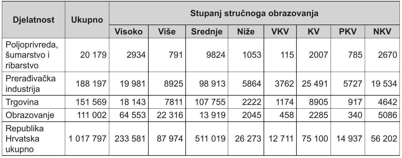 Obrazložite razlike u strukturi zaposlenih za najmanje tri djelatnosti u Republici Hrvatskoj 2015. godine.