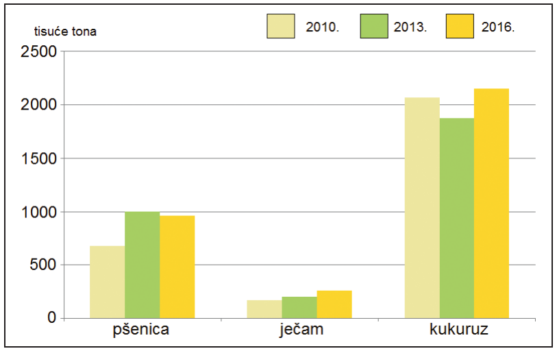 Koja poljoprivredna kultura bilježi kontinuirani trend rasta u proizvodnji žitarica u Republici Hrvatskoj za navedene godine?