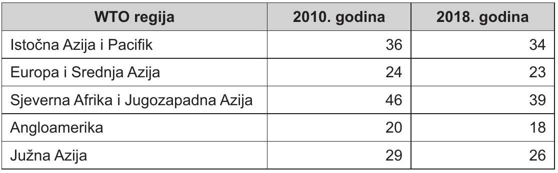Tab. 4. Udio industrije u BDP-u u odabranim WTO regijama 2010. i 2018. godine u %