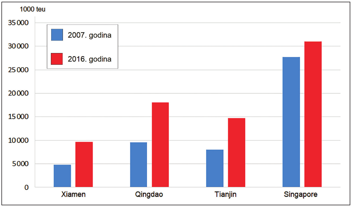 Dijagram prikazuje luke s kontejnerskim prometom prema veličini relativne promjene između 2007. i 2016. godine. Koja je luka zabilježila najveće povećanje kontejnerskoga prometa u apsolutnome iznosu?