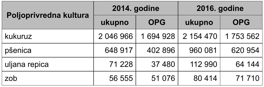 Tab. 2. Proizvodnja odabranih poljoprivrednih kultura u Republici Hrvatskoj 2014. i 2016. godine
