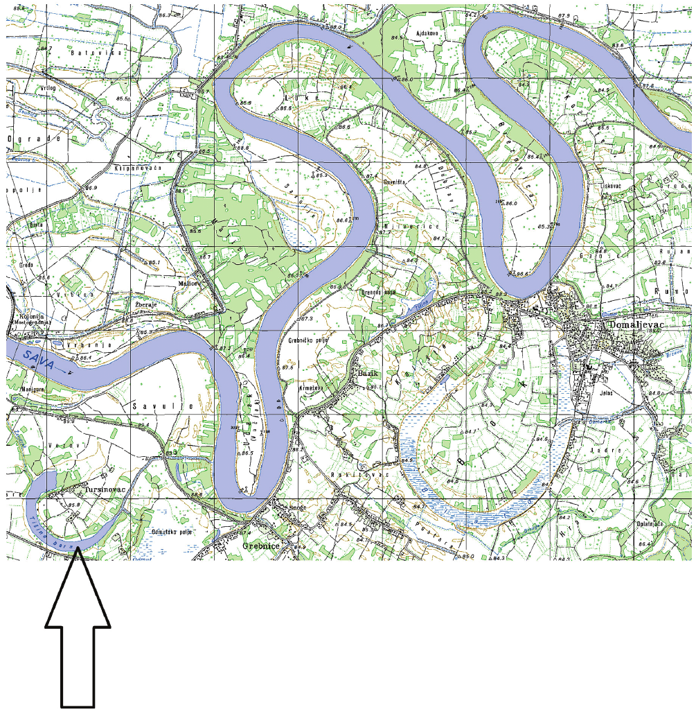 Koji je naziv fluvijalnoga reljefnog oblika (dijela nekadašnjeg toka rijeke) označenoga strelicom na geografskoj karti?