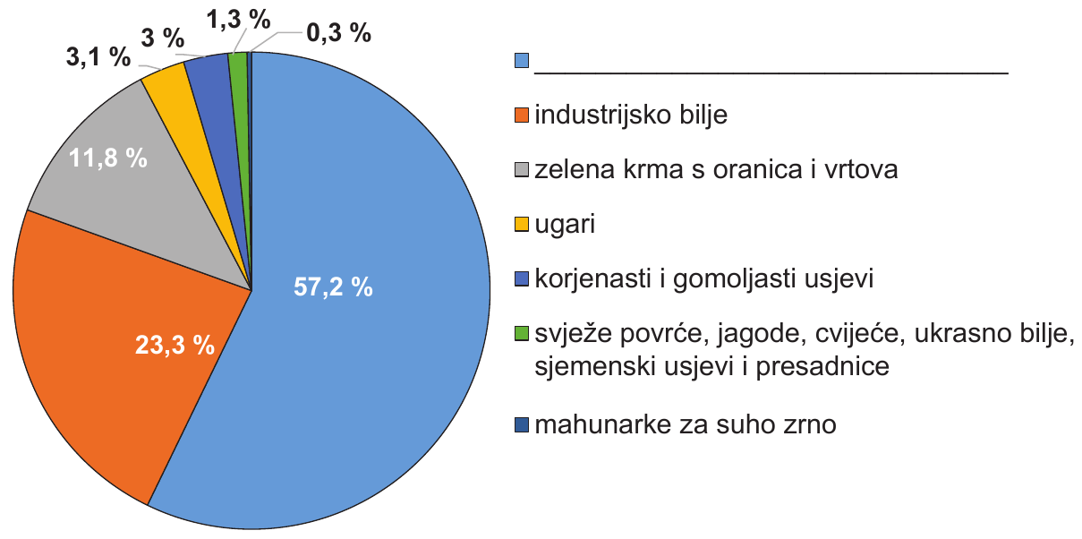 Dijagram prikazuje strukturu poljoprivrednih površina prema zasijanim kulturama u Republici Hrvatskoj 2018. godine. Koji je naziv najzastupljenije skupine poljoprivrednih kultura koja nije upisana u tumač na priloženome dijagramu?