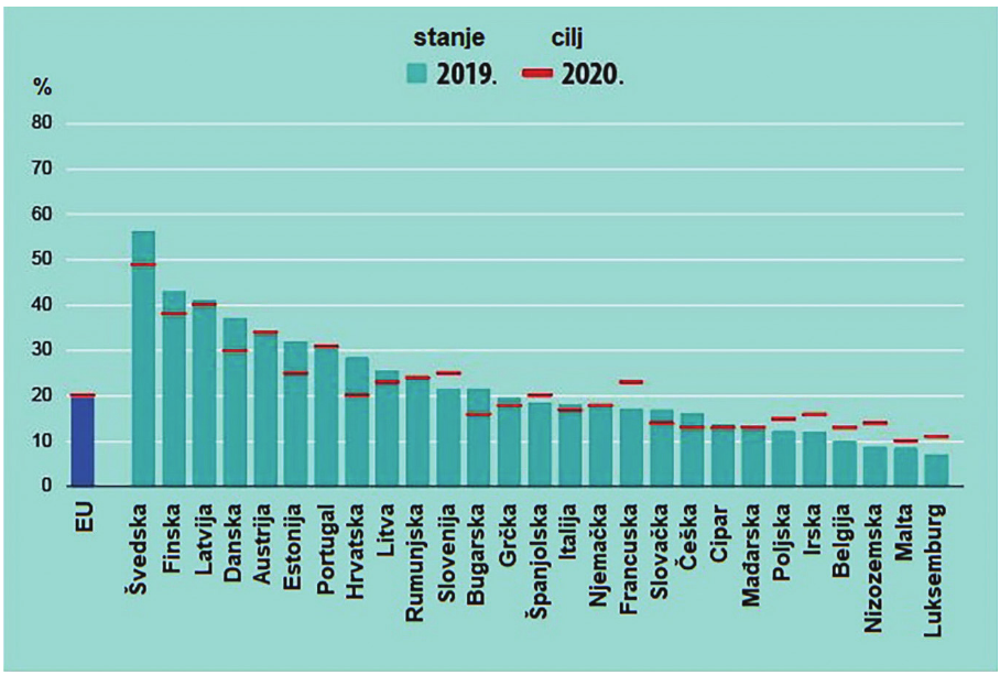 Dijagram prikazuje ukupnu potrošnju energije 2019. godine iz obnovljivih izvora i cilj promjene udjela obnovljivih izvora za 2020. godinu. Koja je od navedenih država postavila cilj koji označava najveći relativan porast u proizvodnji energije iz obnovljivih izvora u 2020. godini?