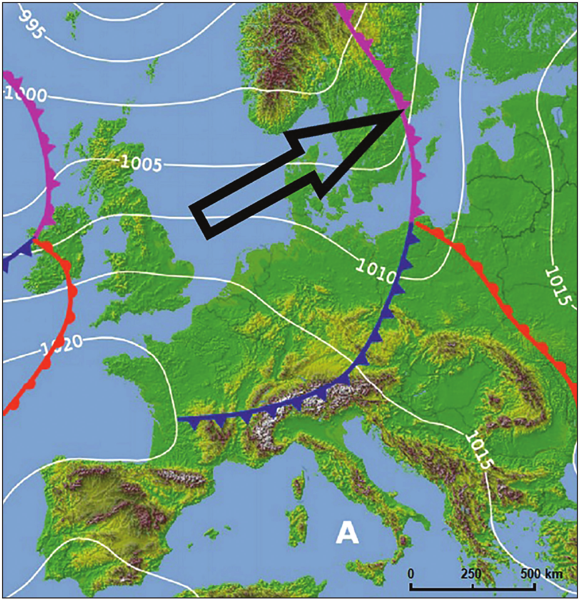 Koji je naziv zračne fronte označene na karti vrhom strelice?