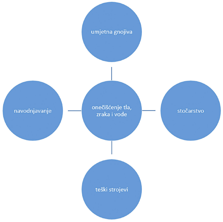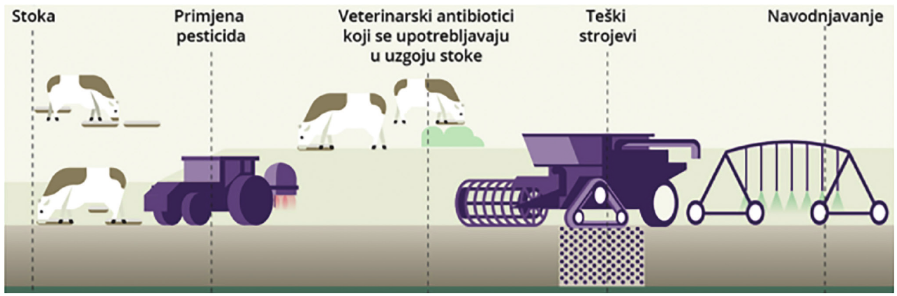 Objasnite najmanje jednom rečenicom jedan negativan učinak moderne poljoprivrede (vidljivna grafičkome prilogu) na tlo, vodu ili zrak.