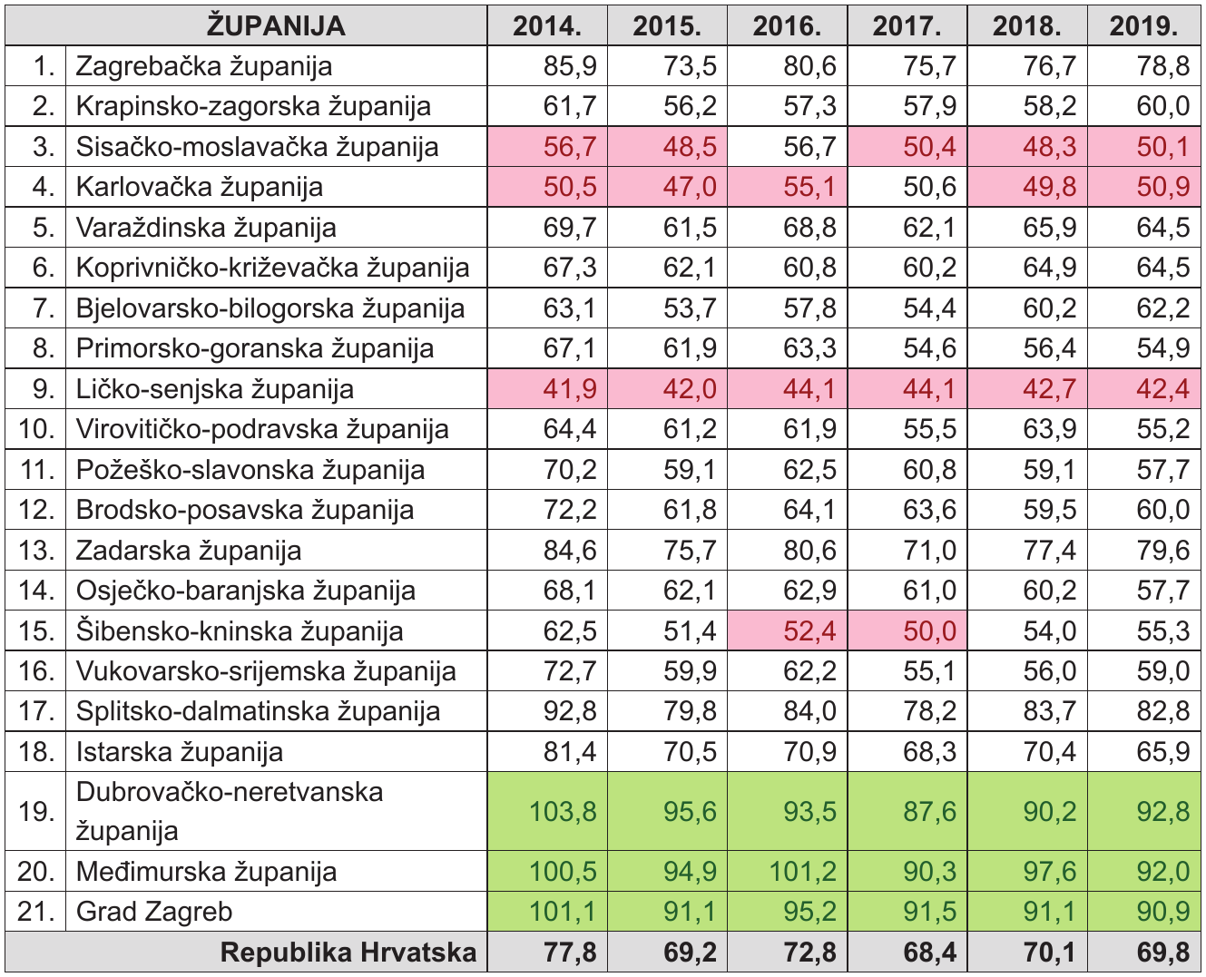 Tab. 3. Indeks vitalnosti Republike Hrvatske od 2014. do 2019. godine po županijama