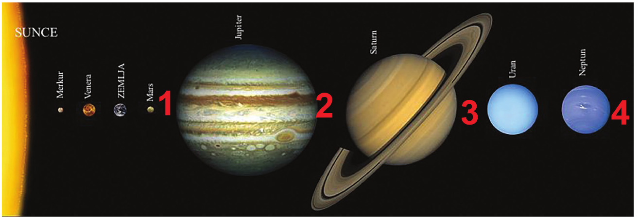 Na grafičkome prilogu prikazani su planeti Sunčeva sustava (mjerilo nije očuvano za udaljenosti). Kojim je brojem označen pojas u kojemu se nalazi Ceres?