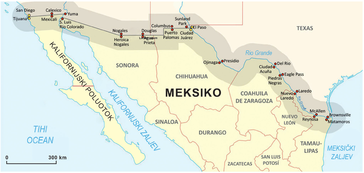 Koji pojam označava gradove koji se nalaze jedan nasuprot drugomu duž granice označene sivom bojom?