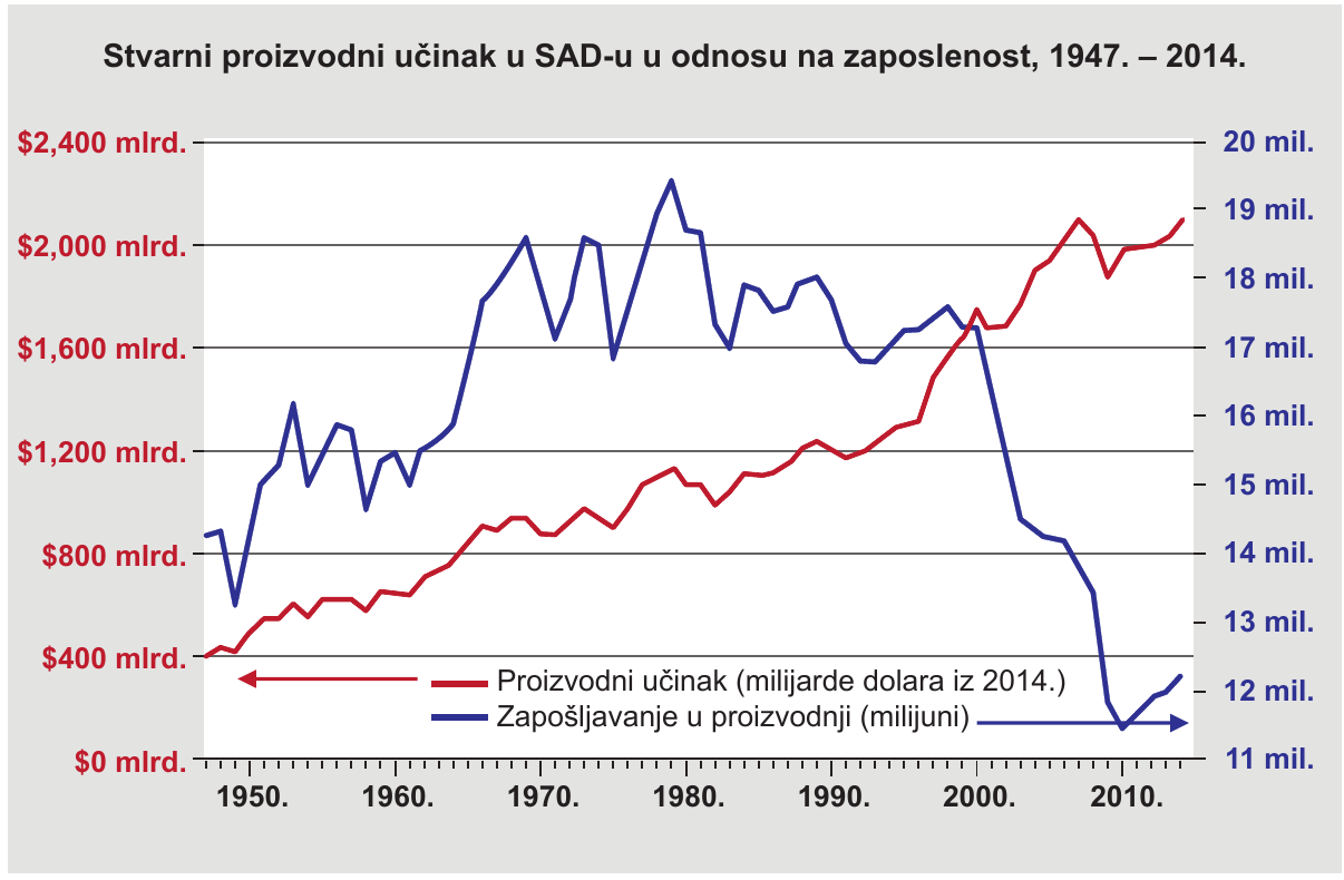 Priloženi dijagram prikazuje odnos broja zaposlenih i vrijednost industrijske proizvodnje uSAD-u od 1947. do 2014. godine.