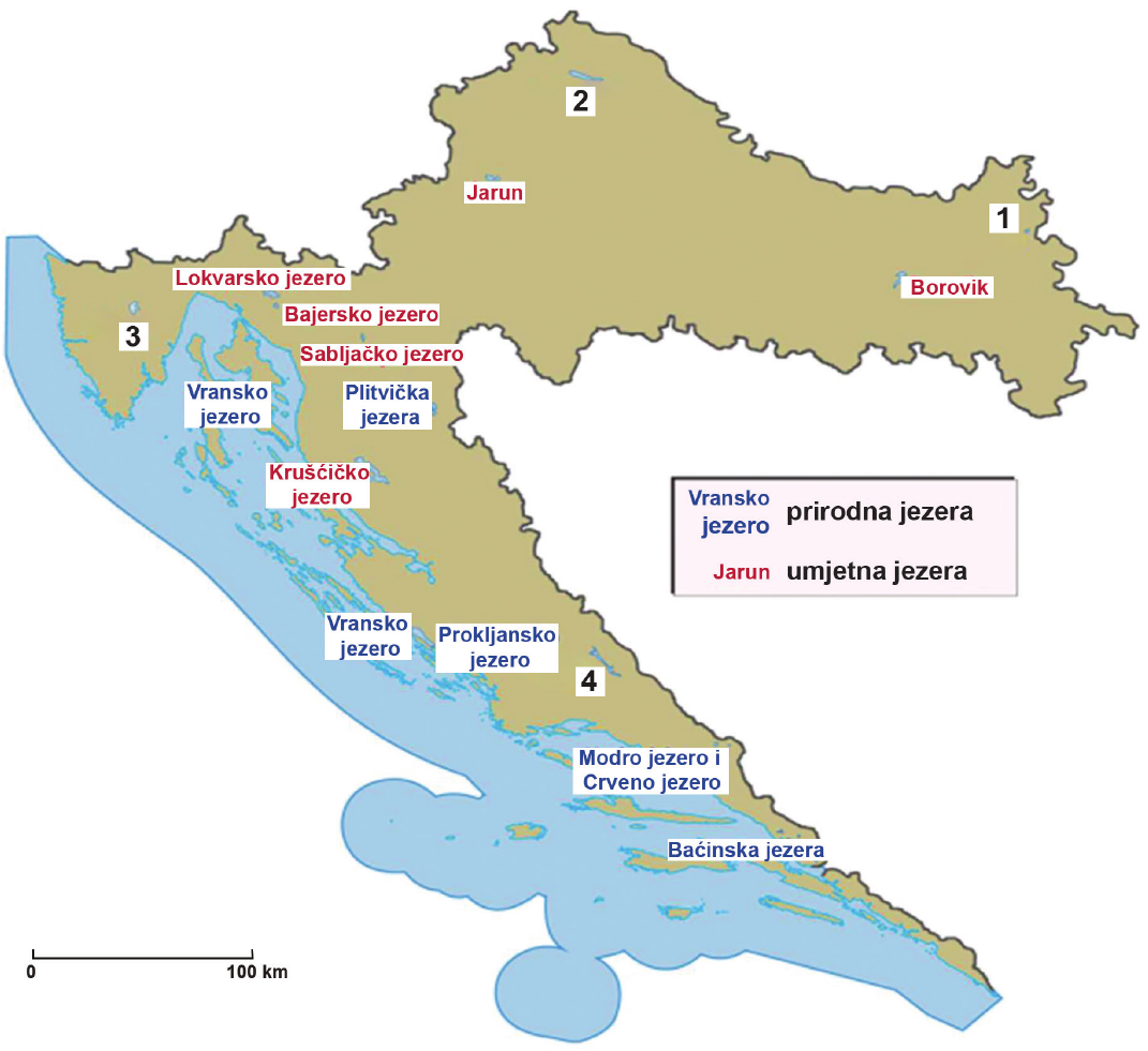 Kojim je brojem na priloženoj geografskoj karti označeno jezero čija je zavala prirodnoga postanka?