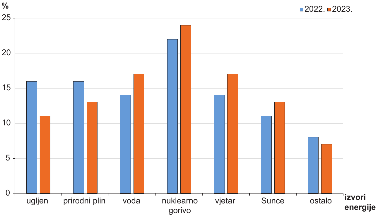 Dijagram prikazuje strukturu ukupne proizvodnje električne energije u Europskoj uniji 2022.i 2023. godine prema izvorima energije. Koji je od navedenih izvora energije imao najmanjirelativni porast u prikazanome razdoblju?