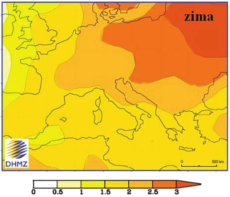 Geografska karta prikazuje projekciju promjene prizemne temperature zraka zimi (u ∘C) u Europi za razdoblje od 2041. do 2070. u odnosu na razdoblje od 1961. do 1990. godine. U kojoj se od navedenih regija Europe zimi očekuje porast temperature zraka 3∘C i više?