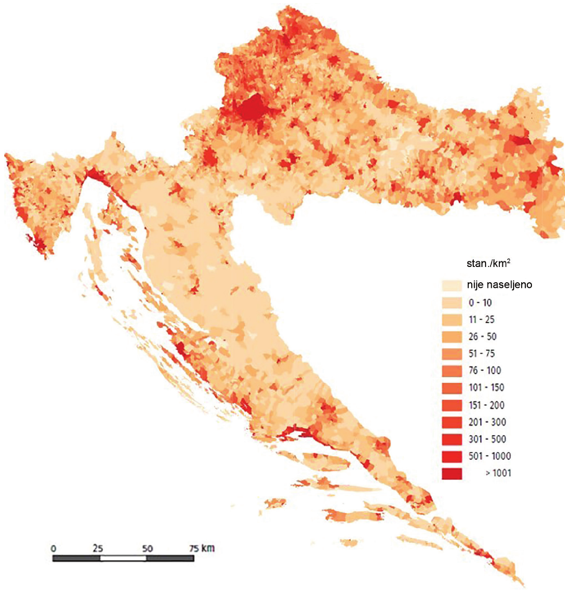 Usporedite gustoću naseljenosti reljefnoga oblika čije su lokacije označene brojevima na geografskoj karti i okolnih područja.