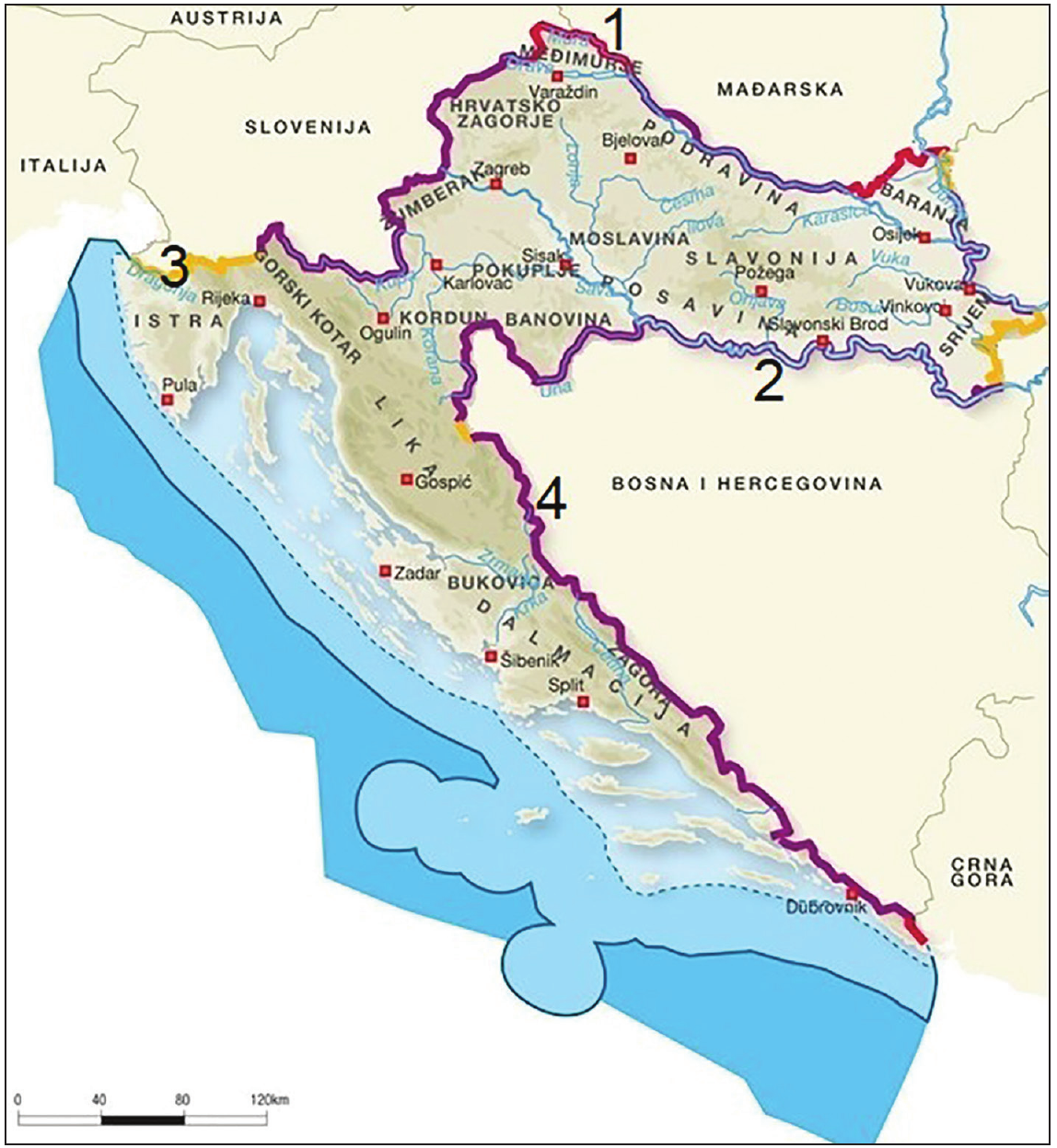 Koji je ispravan kronološki poredak nastanka segmenata hrvatskih granica označenih brojevima?