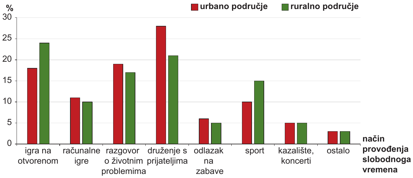 Priloženi dijagram prikazuje strukturu provođenja slobodnoga vremena srednjoškolaca u ruralnim i urbanim područjima Rumunjske. Kod kojega je načina provođenja slobodnoga vremena zabilježena najveća razlika u postotnim bodovima? Navedite jedan razlog takvoga stanja.