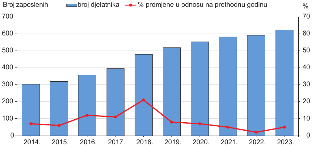 Na dijagramima su prikazani izabrani poslovni rezultati jedne hrvatske tvrtke koja se bavi marikulturom. Prvi dijagram prikazuje prihod od prodaje, drugi broj zaposlenih, a treći udio izvoza u prihodu od prodaje.