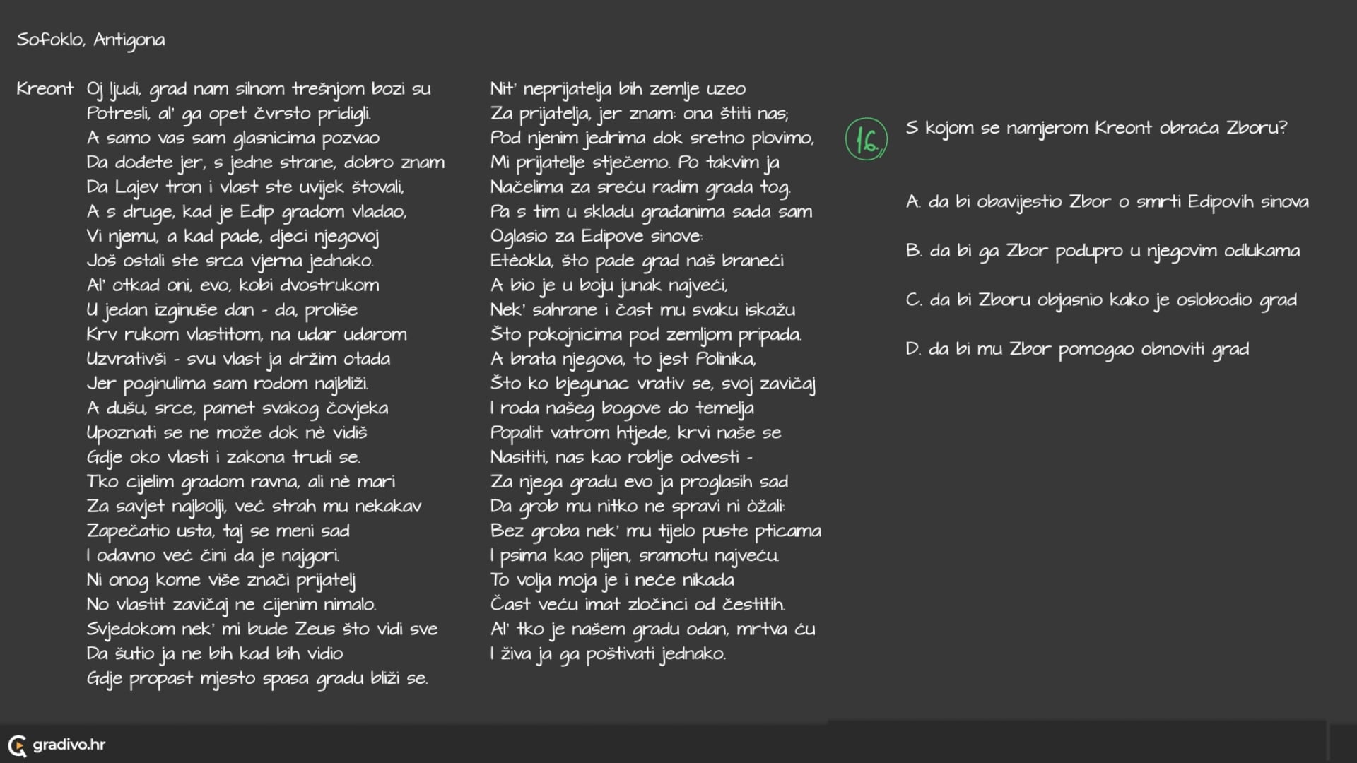 Kreont Oj ljudi, grad nam silnom trešnjom bozi su Potresli, alʼ ga opet čvrsto pridigli. A samo vas sam glasnicima pozvao Da dođete jer, s jedne strane, dobro znam Da Lajev tron i vlast ste uvijek štovali, A s druge, kad je Edip gradom vladao, Vi njemu, a kad pade, djeci njegovoj Još ostali ste srca vjerna jednako. Alʼ otkad oni, evo, kobi dvostrukom U jedan izginuše dan – da, proliše Krv rukom vlastitom, na udar udarom Uzvrativši – svu vlast ja držim otada Jer poginulima sam rodom najbliži. A dušu, srce, pamet svakog čovjeka Upoznati se ne može dok nè vidiš Gdje oko vlasti i zakona trudi se. Tko cijelim gradom ravna, ali nè mari Za savjet najbolji, već strah mu nekakav Zapečatio usta, taj se meni sad I odavno već čini da je najgori. Ni onog kome više znači prijatelj No vlastit zavičaj ne cijenim nimalo. Svjedokom nekʼ mi bude Zeus što vidi sve Da šutio ja ne bih kad bih vidio Gdje propast mjesto spasa gradu bliži se. Nitʼ neprijatelja bih zemlje uzeo Za prijatelja, jer znam: ona štiti nas; Pod njenim jedrima dok sretno plovimo, Mi prijatelje stječemo. Po takvim ja Načelima za sreću radim grada tog. Pa s tim u skladu građanima sada sam Oglasio za Edipove sinove: Etèokla, što pade grad naš braneći A bio je u boju junak najveći, Nekʼ sahrane i čast mu svaku ìskažu Što pokojnicima pod zemljom pripada. A brata njegova, to jest Polìnika, Što ko bjegunac vrativ se, svoj zavičaj | I roda našeg bogove do temelja Popalit vatrom htjede, krvi naše se Nasititi, nas kao roblje odvesti – Za njega gradu evo ja proglasih sad Da grob mu nitko ne spravi ni òžali: Bez groba nekʼ mu tijelo puste pticama I psima kao plijen, sramotu najveću. To volja moja je i neće nikada Čast veću imat zločinci od čestitih. Alʼ tko je našem gradu odan, mrtva ću I živa ja ga poštivati jednako. Zbor To tebi s neprijateljem se svidjelo I s prijateljem grada tog uraditi. Ti služiti se smiješ svakim zakonom Za mrtve ko i zà nas što još živi smo. Kreont Čuvari zapovijedi vi mi budite! Zbor Daj mlađem nekom reci neka bude to! Kreont Alʼ straža stoji ondje kod mrtvaca već. Zbor Pa što još drugo onda ti naređuješ? Kreont Ne pòpuštaj ni ù čem nepokornima! Zbor Te lude nema tko bi mrijeti volio. Kreont Pa to i plaća bit će mu. Alʼ nadanje U dobit često čovjeka upròpasti. (Dolazi stražar.) |