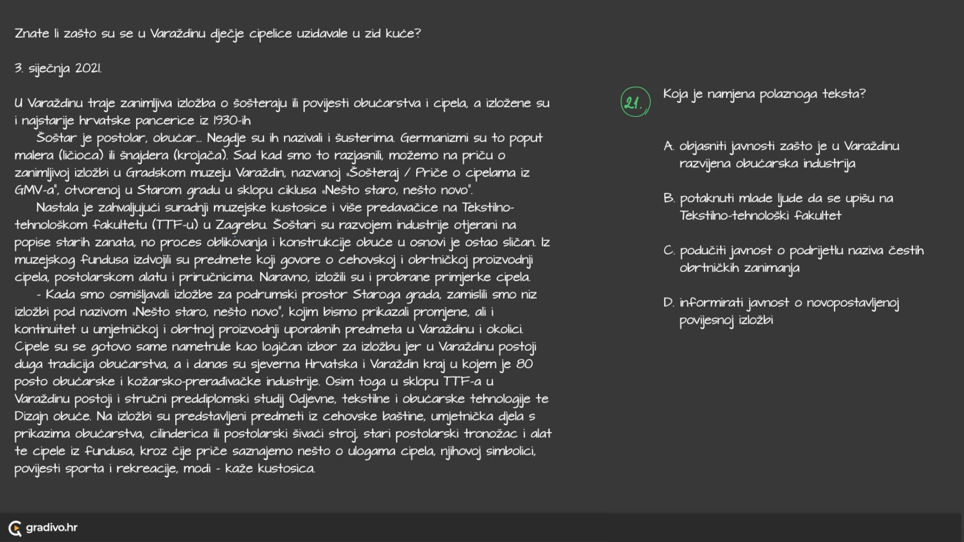 U sklopu izložbe prikazuje se i film Vedrana Hunjeka kojim se predstavlja studij dizajna obuće u Varaždinu i u kojem se vidi proces nastanka cipela u tvornici danas. Povjesnice pak pokazuju da je do prvog organiziranja varaždinskog obrtništva došlo još u 15. st., kad se spominju bratovštine, preteče cehova. Varaždin je procvat doživio u drugoj polovini 18. st. Zvali su ga Mali Beč. Cehovi su privilegije izgubili nakon reformi Marije Terezije 1872. Podsjetnici na cehove danas su cimeri, reklamne ploče i figurice iznad ulaza u obrtničke radnje. U jezgri se još može vidjeti „železni čovek" koji je reklamirao trgovinu željeznom robom ili sirena kao oznaka za trgovinu prekooceanskom robom. Izložba o šošteraju traje do 16. travnja.