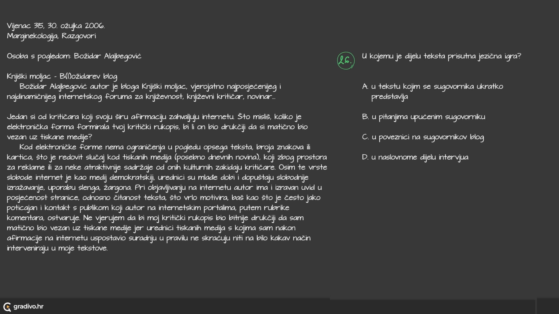 U kojemu od sljedećih primjera sugovornik kritizira društvo koje ne podupire književnost s foruma i blogova?