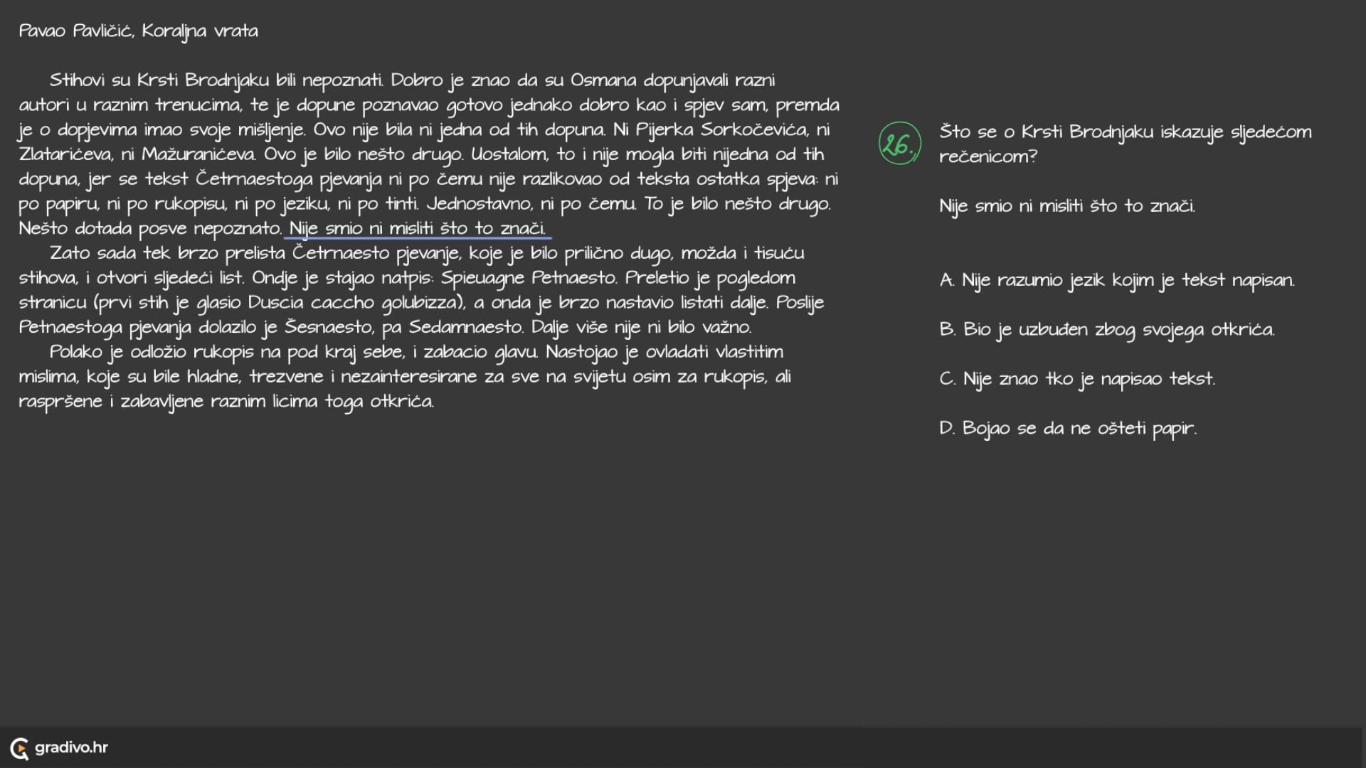 Stihovi su Krsti Brodnjaku bili nepoznati. Dobro je znao da su Osmana dopunjavali razni autori u raznim trenucima, te je dopune poznavao gotovo jednako dobro kao i spjev sam, premda je o dopjevima imao svoje mišljenje. Ovo nije bila ni jedna od tih dopuna. Ni Pijerka Sorkočevića, ni Zlatarićeva, ni Mažuranićeva. Ovo je bilo nešto drugo. Uostalom, to i nije mogla biti nijedna od tih dopuna, jer se tekst Četrnaestoga pjevanja ni po čemu nije razlikovao od teksta ostatka spjeva: ni po papiru, ni po rukopisu, ni po jeziku, ni po tinti. Jednostavno, ni po čemu. To je bilo nešto drugo. Nešto dotada posve nepoznato. Nije smio ni misliti što to znači.