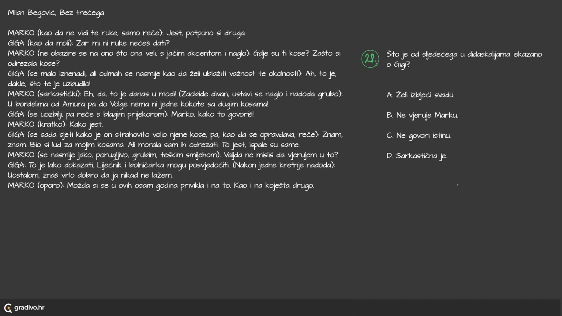 MARKO (ne obazire se na ono što ona veli, s jačim akcentom i naglo): Gdje su ti kose? Zašto si odrezala kose?