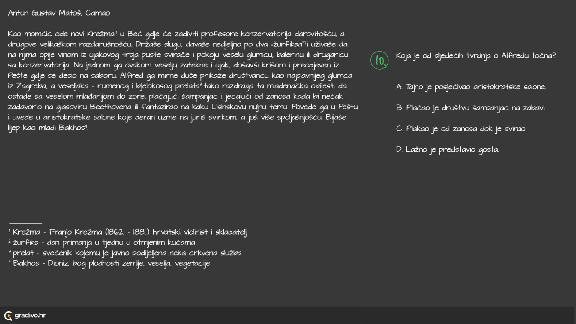 Kao momčić ode novi Krežma1 u Beč gdje će zadiviti profesore konzervatorija darovitošću, a drugove velikaškom razdarušnošću. Držaše slugu, davaše nedjeljno po dva „žurfiksa"2 i uživaše da na njima opije vinom iz ujakovog trsja puste svirače i pokoju veselu glumicu, balerinu ili drugaricu sa konzervatorija. Na jednom ga ovakom veselju zatekne i ujak, došavši krišom i preodjeven iz Pešte gdje se desio na saboru. Alfred ga mirne duše prikaže društvancu kao najslavnijeg glumca iz Zagreba, a veseljaka - rumenog i bjelokosog prelata3 tako razdraga ta mladenačka obijest, da ostade sa veselom mlađarijom do zore, plaćajući šampanjac i jecajući od zanosa kada bi nećak zadavorio na glasoviru Beethovena ili fantazirao na kaku Lisinskovu nujnu temu. Povede ga u Peštu i uvede u aristokratske salone koje deran uzme na juriš svirkom, a još više spoljašnjošću. Bijaše lijep kao mladi Bakhos4.