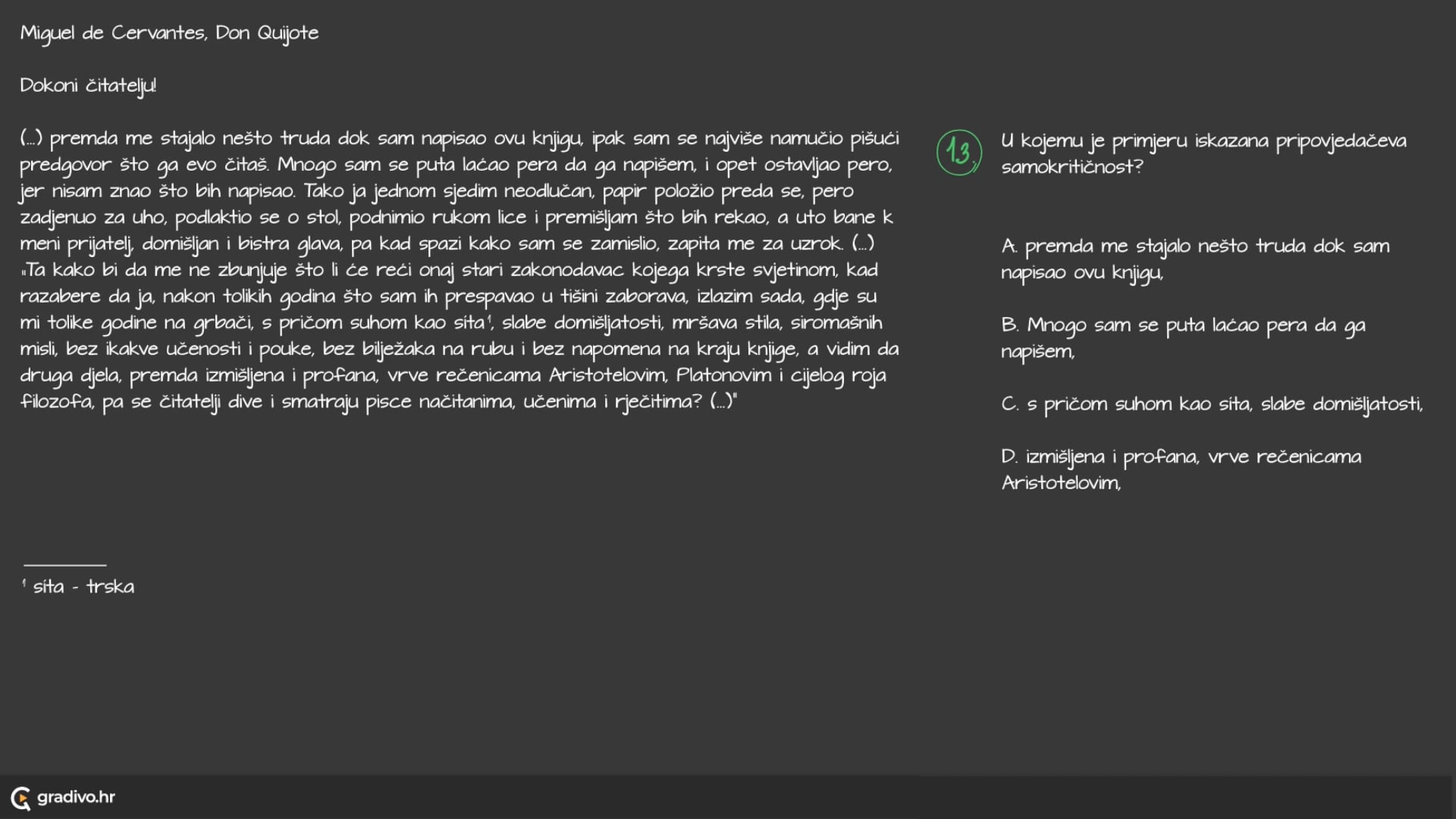 (...) premda me stajalo nešto truda dok sam napisao ovu knjigu, ipak sam se najviše namučio pišući predgovor što ga evo čitaš. Mnogo sam se puta laćao pera da ga napišem, i opet ostavljao pero, jer nisam znao što bih napisao. Tako ja jednom sjedim neodlučan, papir položio preda se, pero zadjenuo za uho, podlaktio se o stol, podnimio rukom lice i premišljam što bih rekao, a uto bane k meni prijatelj, domišljan i bistra glava, pa kad spazi kako sam se zamislio, zapita me za uzrok. (...) „Ta kako bi da me ne zbunjuje što li će reći onaj stari zakonodavac kojega krste svjetinom, kad razabere da ja, nakon tolikih godina što sam ih prespavao u tišini zaborava, izlazim sada, gdje su mi tolike godine na grbači, s pričom suhom kao síta1, slabe domišljatosti, mršava stila, siromašnih misli, bez ikakve učenosti i pouke, bez bilježaka na rubu i bez napomena na kraju knjige, a vidim da druga djela, premda izmišljena i profana, vrve rečenicama Aristotelovim, Platonovim i cijelog roja filozofa, pa se čitatelji dive i smatraju pisce načitanima, učenima i rječitima? (...)"