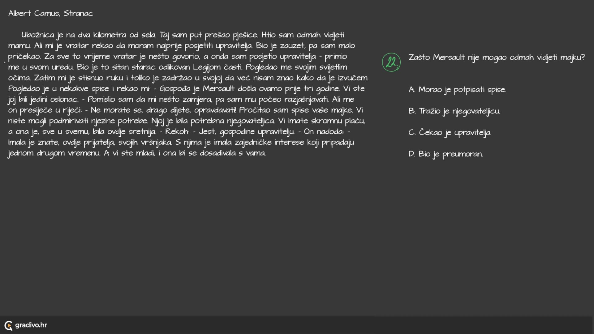 Ubožnica je na dva kilometra od sela. Taj sam put prešao pješice. Htio sam odmah vidjeti mamu. Ali mi je vratar rekao da moram najprije posjetiti upravitelja. Bio je zauzet, pa sam malo pričekao. Za sve to vrijeme vratar je nešto govorio, a onda sam posjetio upravitelja - primio me u svom uredu. Bio je to sitan starac odlikovan Legijom časti. Pogledao me svojim svijetlim očima. Zatim mi je stisnuo ruku i toliko je zadržao u svojoj da već nisam znao kako da je izvučem. Pogledao je u nekakve spise i rekao mi: - Gospođa je Mersault došla ovamo prije tri godine. Vi ste joj bili jedini oslonac. - Pomislio sam da mi nešto zamjera, pa sam mu počeo razjašnjavati. Ali me on presiječe u riječi. - Ne morate se, drago dijete, opravdavatil Pročitao sam spise vaše majke. Vi niste mogli podmirivati njezine potrebe. Njoj je bila potrebna njegovateljica. Vi imate skromnu plaću, a ona je, sve u svemu, bila ovdje sretnija. - Rekoh: - Jest, gospodine upravitelju. - On nadoda: Imala je znate, ovdje prijatelja, svojih vršnjaka. S njima je imala zajedničke interese koji pripadaju jednom drugom vremenu. A vi ste mladi, i ona bi se dosađivala s vama.